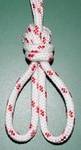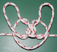 To tie this knot, create a small loop in a doubled rope (similar to a basic Bowline), and bring the end of the doubled rope up through the small loop (picture 1). This creates two big loops which hang below the knot (where the basic Bowline has only one big loop). Now open up the end of the doubled rope and bring it down and around over the two main loops (picture 2), and then continue bringing it up above the small initial loop (picture 3). Dress and set the knot (picture 4). Now it looks like a Double-Knotted Bowline but with two loops instead of only one.