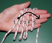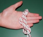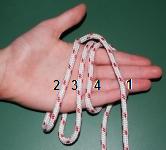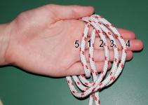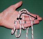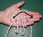 of rope laying across your fingers with a strand of rope coming through it. Pass the end of the rope into the