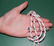 and around your fingers until it lays over the tops of the two strands of rope on your fingers (picture 3). Wrap the end of the rope twice around the two strands of rope on top of your fingers and then tighten the knot, just like you would do with the