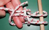 (picture 4). In picture 4, pull out the strand of rope which you created in picture 2, and use it to adjust the relative sizes of the two loops which have been passed around the object, then finish dressing and setting the knot (picture 5).