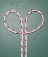 First double the rope to create a long bight (an open loop), then bring the end of the bight back behind the main part of the rope to create two loops (picture 1) and give each loop a twist (picture 2). Then take the loop on the left and move it over to the right inside of the loop on the right (picture 3). The "X" (the crossed ropes) in picture 3 is on the outside, on top of the two vertical lines of rope. Picture 3 shows four "loops," and you extend the two bottom "loops" and bring them up and through the two upper loops to form the two main loops (picture 4). Dress and set the knot (picture 5).