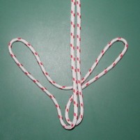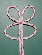 Ashley referred to this as a double splayed loop in the bight, and it's listed as #1100 in The Ashley Book of Knots (hence the name "ABOK #1100"). To tie this knot, start with a loose Alpine Butterfly (picture 1). In picture 1, notice that there's a tall loop sticking straight up the middle, and there are two other loops on the sides of the tall vertical loop. Bring those two loops through the tall vertical loop (picture 2). Bring the tall vertical loop toward you and down so that it lays below the rest of the knot (picture 3). Carefully dress and set the knot (picture 4).
