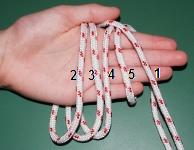To tie a Triple Alpine Butterfly, wrap the rope several times around your hand so that you have five strands of rope laying on the palm of your hand (picture 1 below). The three strands in the middle (strands 2, 3, and 4) will become the loops, so make them as big as they need to be (as in picture 1). Grab the left-most strand (#1 in picture 1) and bring it all the way to the right over all of the other strands (pictures 1 and 2). Now grab the three left-most strands (#2, #3, and #4 in picture 3) and bring them all the way to the right over all of the other strands (pictures 3 and 4). After bringing strands 2, 3, and 4 over the other strands, push those three back to the left under the other strands (picture 5). Dress the knot as in picture 6.